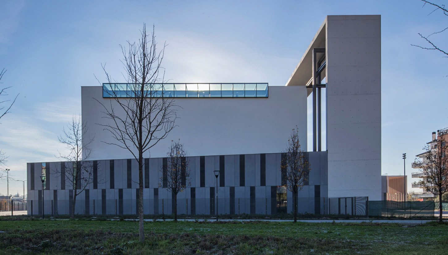 Die Anlage in Pentecoste ist die erste Caritas-Kirche in Europa. Sie liegt an der Peripherie Mailands, in einem neuen Wohngebiet, umgeben von Industriebrachen und einem neu konzipierten Landschaftspark. Eine der Hauptaufgaben der hier tätigen Caritas-Organisation ist die umfangreiche Sammeltätigkeit von Gütern, die man im Untergeschoss der großen Kirche sortiert und lagert, um sie dann im Süden des Landes an sozial bedürftige Menschen zu verteilen. Das Projekt von Boris Podrecca wurde nach einem internationalen Gutachterverfahren zur Ausführung empfohlen.